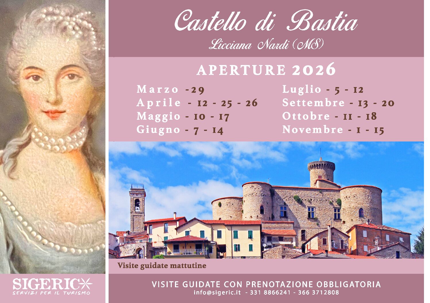 • Orario: La visita guidata si svolgerà nelle mattine delle date indicate con prenotazione obbligatoria (orari comunicati in fase di prenotazione). In tutte le date, al pomeriggio, sarà visitabile anche il Castello Malaspina di Monti previa prenotazione necessaria.