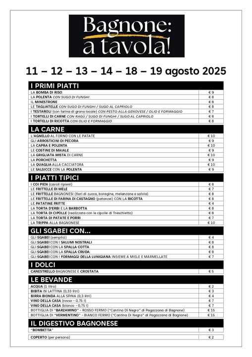 Bagnone a Tavola 2025 Nel borgo di Bagnone sei serate dedicate a Cucina Sapori Tradizione Musica + Aggiungi a Google Calendar + esporta iCal / Outlook Data 19 Ago 2025 Scaduto Ora 19:00 Comuni Bagnone Luogo Bagnone Categoria Food Condividi questo evento