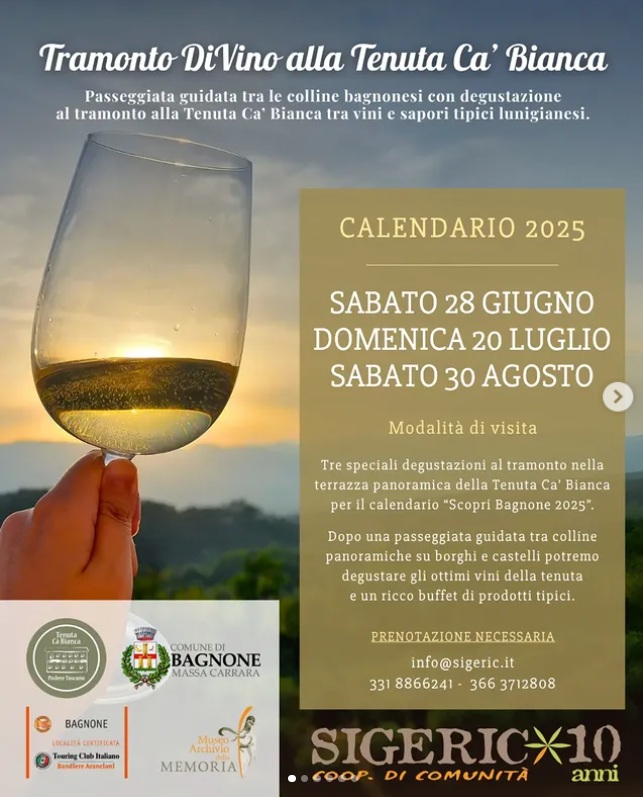 - Tenuta Cà Bianca– Bagnone: Sabato 28 giugno, Domenica 20 luglio, Sabato 30 agosto