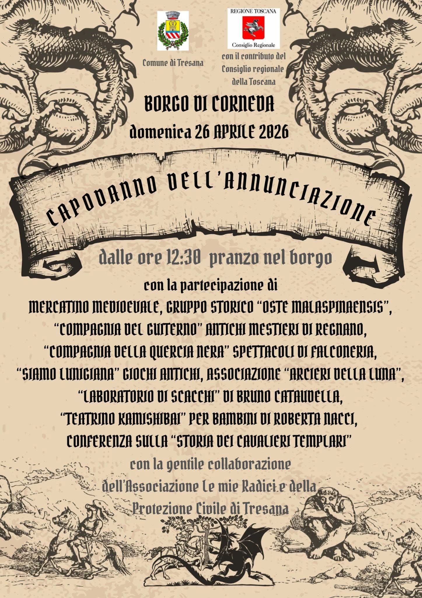A Corneda (Tresana) rievocazione storica per le vie del borgo: mercato medievale, antichi mestieri, tiro con l’arco storico, spettacoli a tema. Dalle ore 12:30 possibilità di pranzo