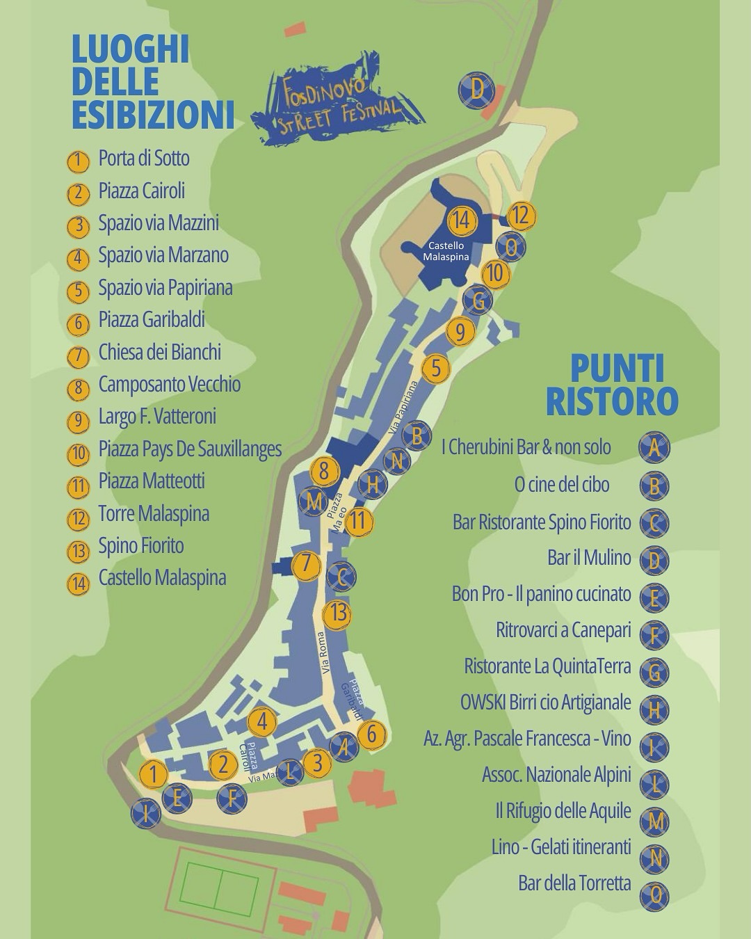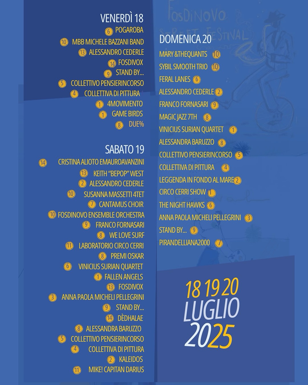 L’evento, gratuito, si aprirà ogni giorno dalle 18. Proporrà ogni sera una line-up di musicisti selezionati in tutto il panorama italiano (e non solo). Per tutti i gusti: il trio Gorgone Sybil Smoot Roventini, Liliana Biciacci 7tet, Keith West, Mary & the Quants, Game Birds, Fosdivox, Pogaroba, Alessandro Cederle, Michele Bazzani Band, Fallen Angels, Feran Lanes, The Nighthawks, Vinicius Surian Quartet, Premi Oskar, WE LOVE SURF, Franco Fornasari, il quartetto Bertone Massetti Griffa Cosso, Mauro Avanzini e Cristina Alioto, la neonata Fosdinovo Ensemble Orchestra, Coro Cantamus Choir e, infine, “Cafè Ouvert” per Locanda De’ Banchieri, il trio di Denya Ridley per la Burlanda di via Fabiano. In parallelo molti spettacoli lungo il borgo con performance di arti circensi, danza, teatro a cura di compagnie e scuole del comprensorio.