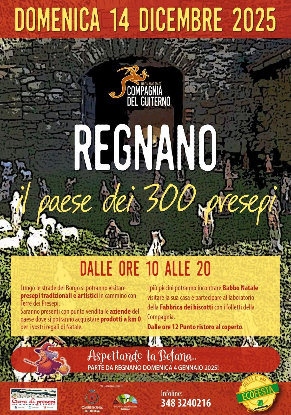 Lungo le strade del borgo di Regnano (Casola in L.na) sarà possibile visitare un’esposizione di oltre 300 presepi tradizionali ed artistici. Inoltre mercatino dei produttori, laboratorio dei Biscotti ed incontro con Babbo Natale con i folletti della Compagnia del Guiterno