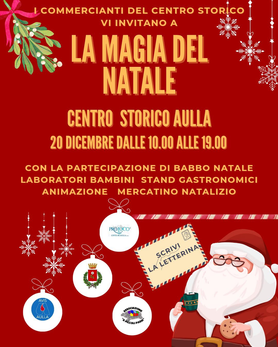 Il Natale e ormai vicino, venite a scoprirlo nel centro storico e giardini M. Guidoni di Aulla. Per tutto il giorno si terrà per le vie un suggestivo mercatino natalizio e ci saranno tante sorprese anche per i più piccoli: Babbo Natale e la sua casetta, lo spettacolo delle bolle giganti e i numeri con il fuoco. Venite a scrivere le letterine per Babbo Natale con l ass. “A Piccoli Passi” e infine non mancherà la gastronomia da passeggio e non. I commercianti del centro Storico vi aspettano!