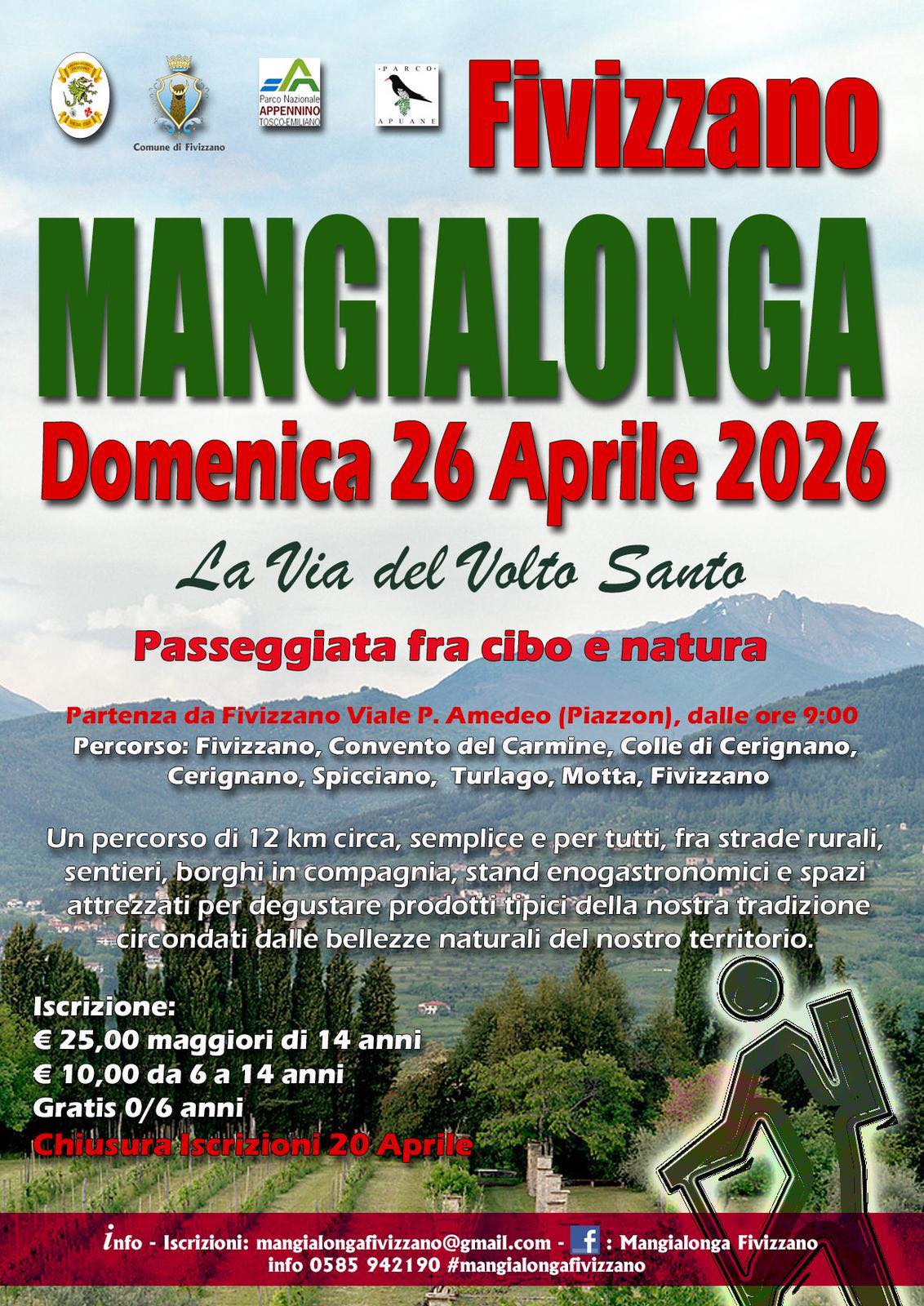 Per l’edizione 2026 ci sarà un percorso ad anello di circa 12 km che partirà da Fivizzano in P.zza Amedeo, raggiungerà il Convento del Carmine, Colle di Cerignano, Cerignano, Spicciano, Turlago, Motta e poi tornerà al punto di partenza.