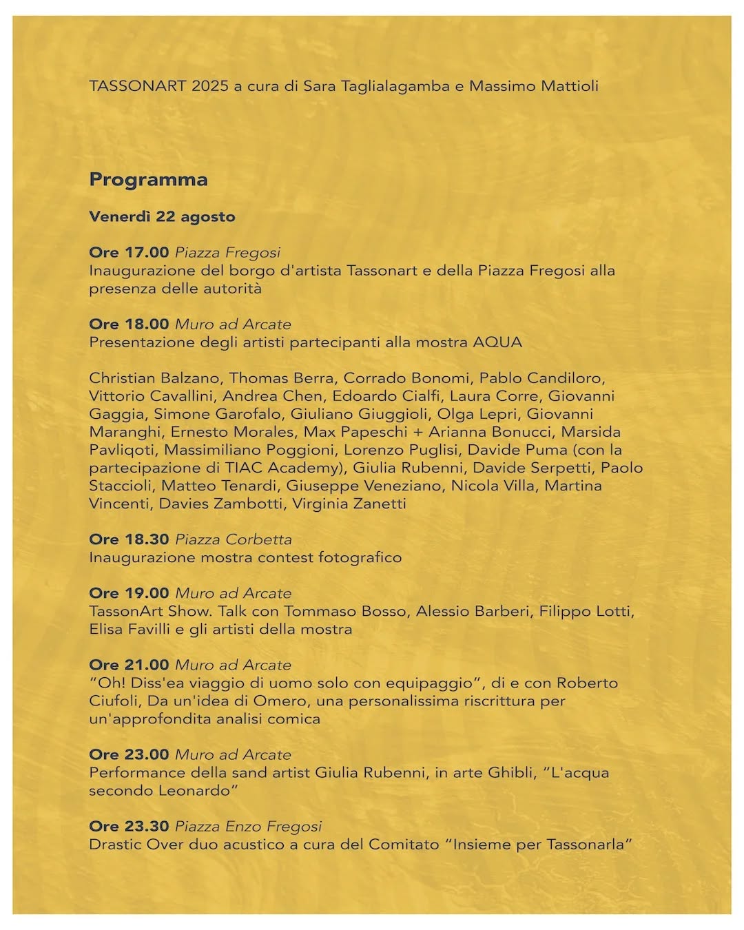 Si confronteranno sul tema principale con le modalità più disparate, dai dipinti alle fotografie, dalle sculture alle installazioni, ai video. Fino ad alcune grandi e spettacolari azioni performative che sorprenderanno i visitatori.